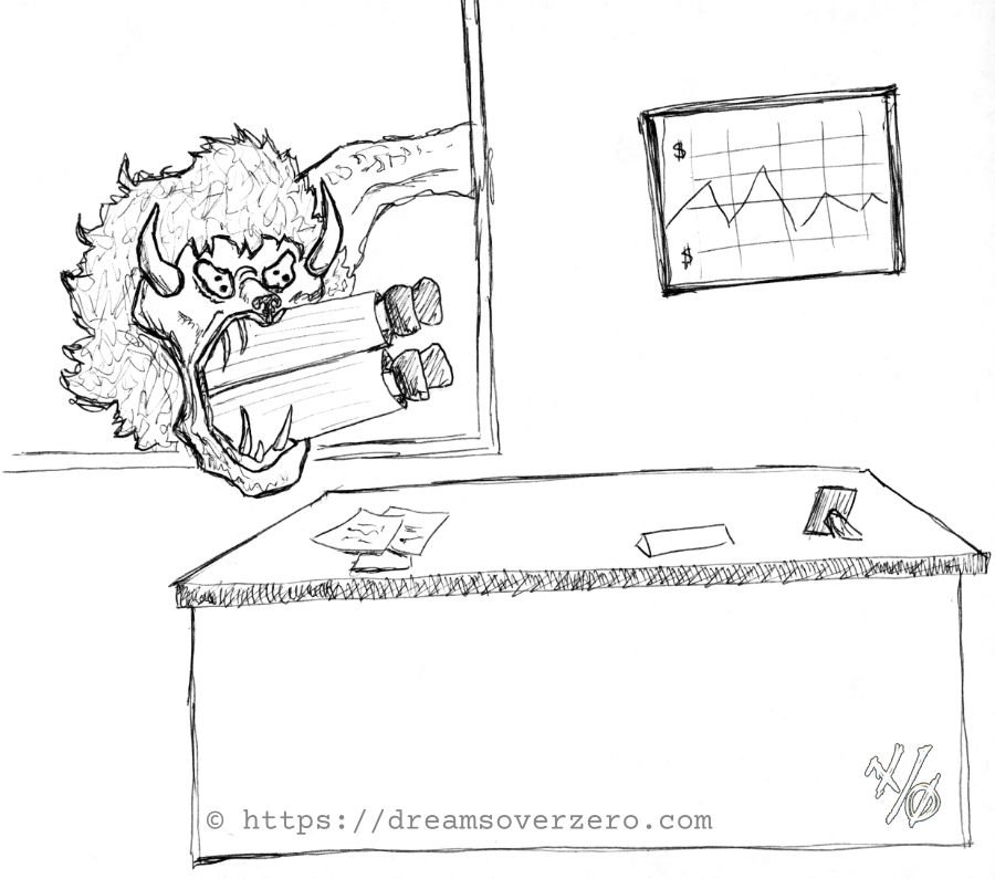 “Drawers! My new desk has drawers! That’s exactly what I wanted! Wow! This being-assertive thing really works. Look, there’s even room for a potted plant.” — Waddlesnatch, upon being shown to his new cubicle